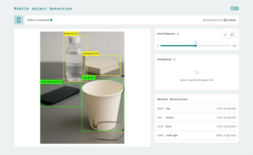 Camera streaming happens entirely on your local network. Your phone connects directly to your UNO Q, with no cloud involvement. Position your phone across the room, on a moving platform, attached to a robotic arm, or held in your hand while testing object detection, all without worrying about cable length or disconnections.