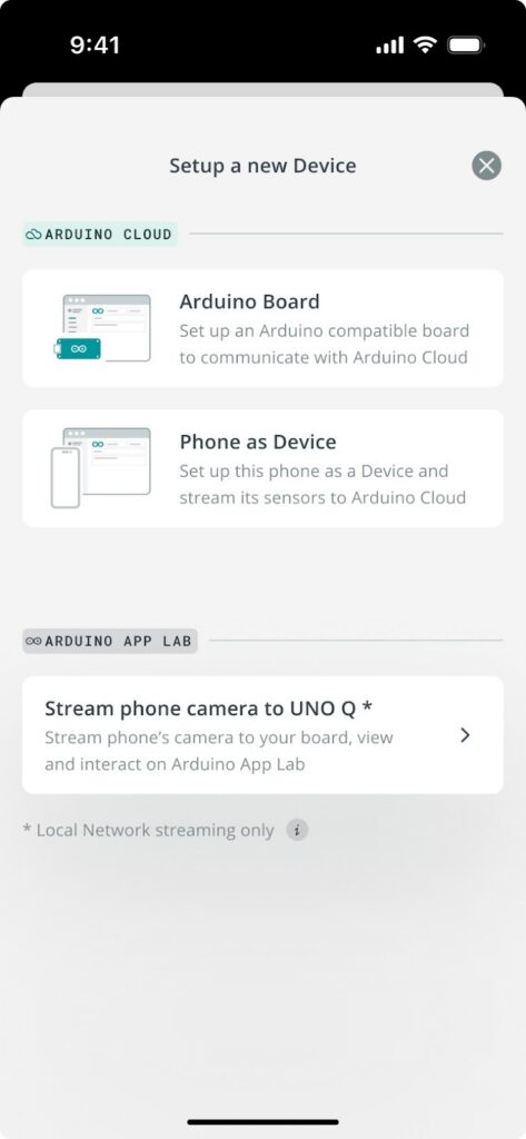 With the QR code provided from Arduino App Lab, open or download the Arduino IoT Remote App on your phone, set-up a new device and select “Stream phone camera to UNO Q”. Camera streaming to UNO Q uses a local network connection, sending data directly to your board without going through Arduino Cloud servers.