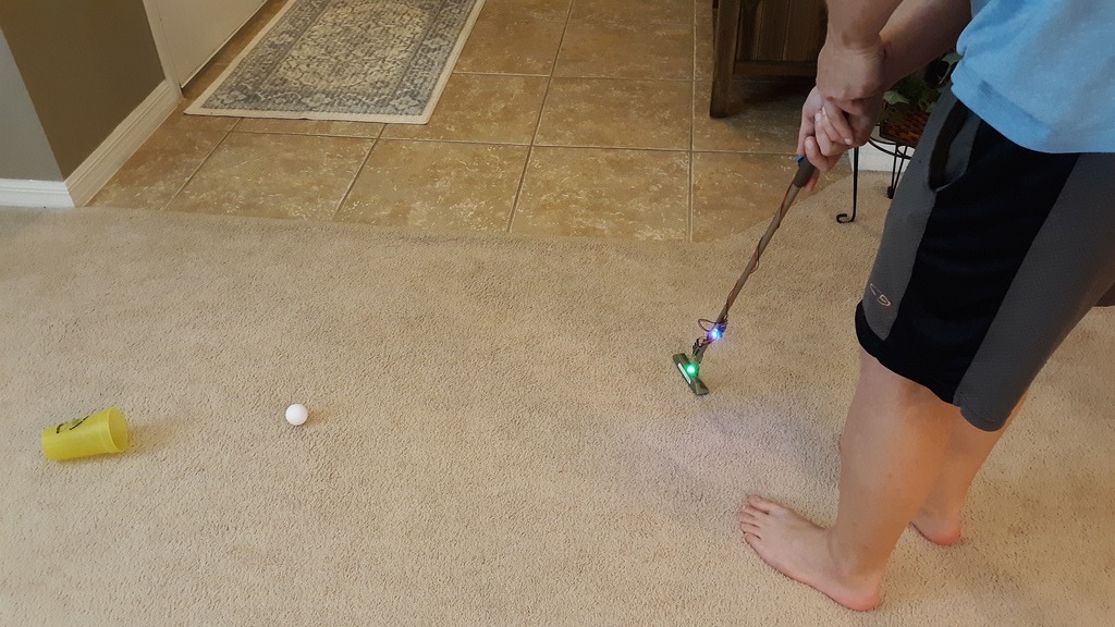 When the player is ready to begin using the club, they can press a button, after which the onboard accelerometer of an Arduino Nano 33 IoT begins recording the movements of the putter. He trained a K-means clustering anomaly detection algorithm with data from many correct motions in the Edge Impulse, meaning that anything outside of the normal range can be recognized as a poor putt. From here, the model outputs if the recorded motion is close enough to correct, and if so lights up an RGB LED in green. Otherwise, the light turns red to signal poor technique.
